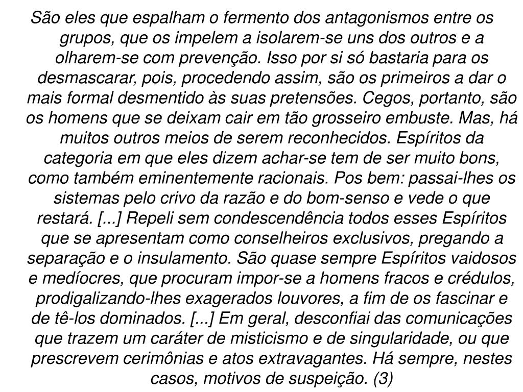 São eles que espalham o fermento dos antagonismos entre os grupos, que os impelem a isolarem-se uns dos outros e a olharem-se com prevenção. Isso por si só bastaria para os desmascarar, pois, procedendo assim, são os primeiros a dar o mais formal desmentido às suas pretensões. Cegos, portanto, são os homens que se deixam cair em tão grosseiro embuste. Mas, há muitos outros meios de serem reconhecidos. Espíritos da categoria em que eles dizem achar-se tem de ser muito bons, como também eminentemente racionais. Pos bem: passai-lhes os sistemas pelo crivo da razão e do bom-senso e vede o que restará. [...] Repeli sem condescendência todos esses Espíritos que se apresentam como conselheiros exclusivos, pregando a separação e o insulamento. São quase sempre Espíritos vaidosos e medíocres, que procuram impor-se a homens fracos e crédulos, prodigalizando-lhes exagerados louvores, a fim de os fascinar e de tê-los dominados. [...] Em geral, desconfiai das comunicações que trazem um caráter de misticismo e de singularidade, ou que prescrevem cerimônias e atos extravagantes. Há sempre, nestes casos, motivos de suspeição. (3)
