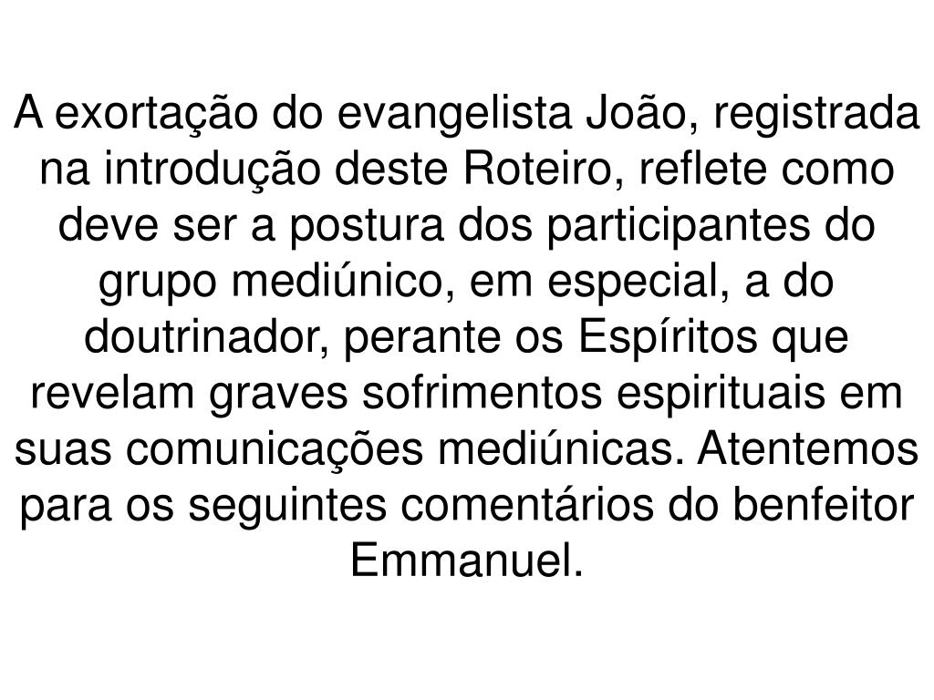 A exortação do evangelista João, registrada na introdução deste Roteiro, reflete como deve ser a postura dos participantes do grupo mediúnico, em especial, a do doutrinador, perante os Espíritos que revelam graves sofrimentos espirituais em suas comunicações mediúnicas. Atentemos para os seguintes comentários do benfeitor Emmanuel.