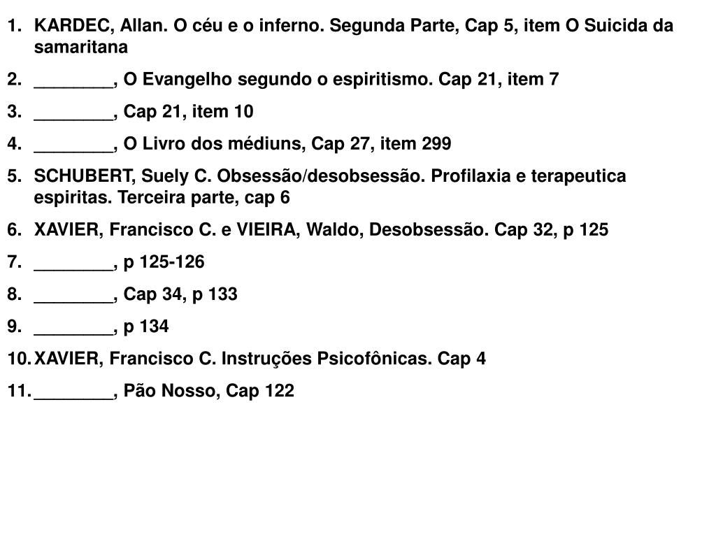 KARDEC, Allan. O céu e o inferno. Segunda Parte, Cap 5, item O Suicida da samaritana • ________, O Evangelho segundo o espiritismo. Cap 21, item 7 • ________, Cap 21, item 10 • ________, O Livro dos médiuns, Cap 27, item 299 • SCHUBERT, Suely C. Obsessão/desobsessão. Profilaxia e terapeutica espiritas. Terceira parte, cap 6 • XAVIER, Francisco C. e VIEIRA, Waldo, Desobsessão. Cap 32, p 125 • ________, p 125-126 • ________, Cap 34, p 133 • ________, p 134 • XAVIER, Francisco C. Instruções Psicofônicas. Cap 4 • ________, Pão Nosso, Cap 122