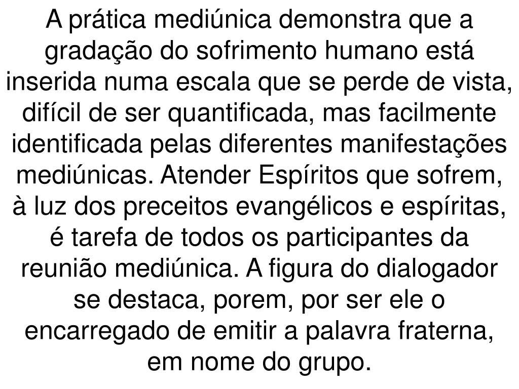 A prática mediúnica demonstra que a gradação do sofrimento humano está inserida numa escala que se perde de vista, difícil de ser quantificada, mas facilmente identificada pelas diferentes manifestações mediúnicas. Atender Espíritos que sofrem, à luz dos preceitos evangélicos e espíritas, é tarefa de todos os participantes da reunião mediúnica. A figura do dialogador se destaca, porem, por ser ele o encarregado de emitir a palavra fraterna, em nome do grupo.
