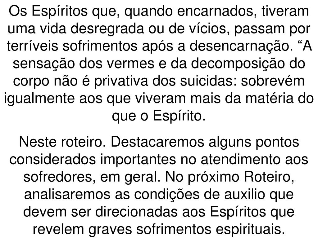 Os Espíritos que, quando encarnados, tiveram uma vida desregrada ou de vícios, passam por terríveis sofrimentos após a desencarnação. “A sensação dos vermes e da decomposição do corpo não é privativa dos suicidas: sobrevém igualmente aos que viveram mais da matéria do que o Espírito. Neste roteiro. Destacaremos alguns pontos considerados importantes no atendimento aos sofredores, em geral. No próximo Roteiro, analisaremos as condições de auxilio que devem ser direcionadas aos Espíritos que revelem graves sofrimentos espirituais.