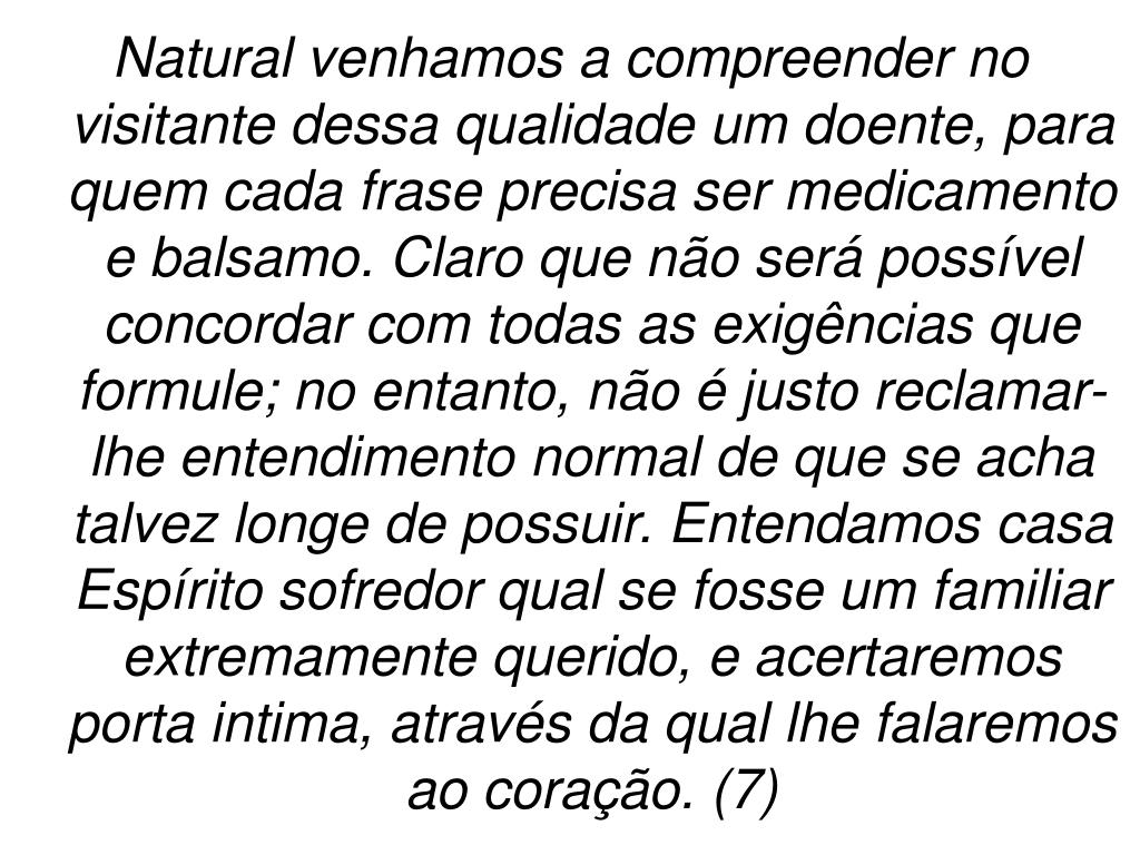 Natural venhamos a compreender no visitante dessa qualidade um doente, para quem cada frase precisa ser medicamento e balsamo. Claro que não será possível concordar com todas as exigências que formule; no entanto, não é justo reclamar-lhe entendimento normal de que se acha talvez longe de possuir. Entendamos casa Espírito sofredor qual se fosse um familiar extremamente querido, e acertaremos porta intima, através da qual lhe falaremos ao coração. (7)