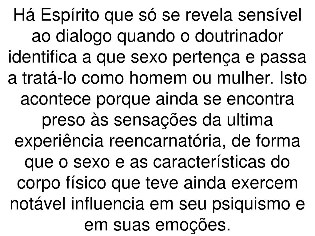 Há Espírito que só se revela sensível ao dialogo quando o doutrinador identifica a que sexo pertença e passa a tratá-lo como homem ou mulher. Isto acontece porque ainda se encontra preso às sensações da ultima experiência reencarnatória, de forma que o sexo e as características do corpo físico que teve ainda exercem notável influencia em seu psiquismo e em suas emoções.