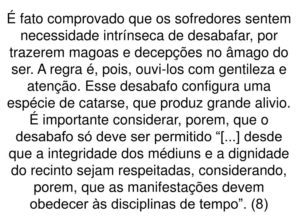 É fato comprovado que os sofredores sentem necessidade intrínseca de desabafar, por trazerem magoas e decepções no âmago do ser. A regra é, pois, ouvi-los com gentileza e atenção. Esse desabafo configura uma espécie de catarse, que produz grande alivio. É importante considerar, porem, que o desabafo só deve ser permitido “[...] desde que a integridade dos médiuns e a dignidade do recinto sejam respeitadas, considerando, porem, que as manifestações devem obedecer às disciplinas de tempo”. (8)