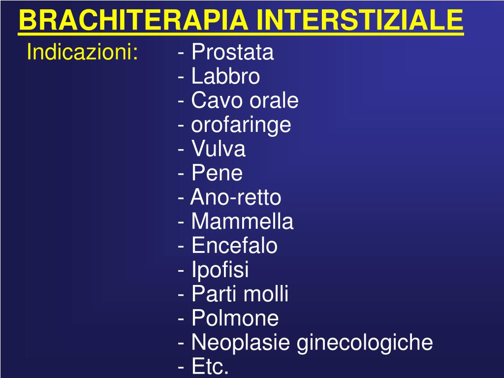 BRACHITERAPIA INTERSTIZIALE Indicazioni: - Prostata - Labbro - Cavo orale - orofaringe - Vulva - Pene - Ano-retto - Mammella - Encefalo - Ipofisi - Parti molli - Polmone - Neoplasie ginecologiche - Etc.
