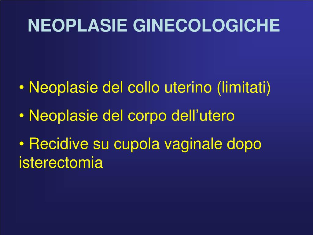 NEOPLASIE GINECOLOGICHE • Neoplasie del collo uterino (limitati) • Neoplasie del corpo dell’utero • Recidive su cupola vaginale dopo isterectomia