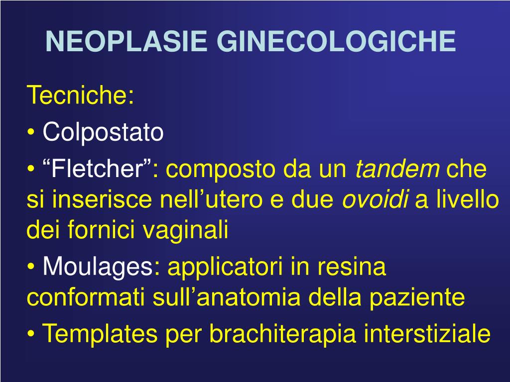 NEOPLASIE GINECOLOGICHE “Fletcher”: composto da un tandem che si inserisce nell’utero e due ovoidi a livello dei fornici vaginali. Viene usato come trattamento esclusivo delle forme della cervice non operabili o in paz tecnicamente non trattabile con RT tradizionale (obesità, età avanzata). DOSE: 70 Gy puntoA