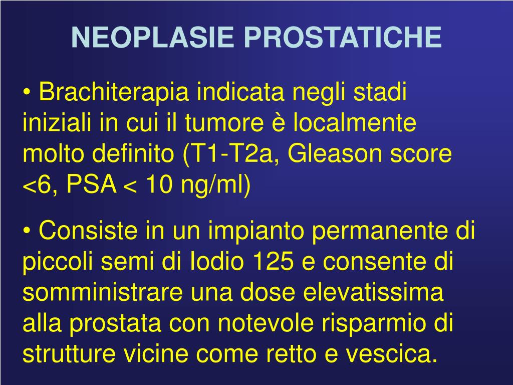 NEOPLASIE PROSTATICHE • Brachiterapia indicata negli stadi iniziali in cui il tumore è localmente molto definito (T1-T2a, Gleason score <6, PSA < 10 ng/ml) • Consiste in un impianto permanente di piccoli semi di Iodio 125 e consente di somministrare una dose elevatissima alla prostata con notevole risparmio di strutture vicine come retto e vescica.