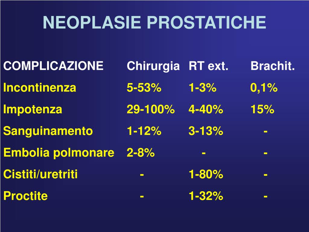NEOPLASIE PROSTATICHE COMPLICAZIONE Chirurgia RT ext. Brachit. Incontinenza 5-53% 1-3% 0,1% Impotenza 29-100% 4-40% 15% Sanguinamento 1-12% 3-13% - Embolia polmonare 2-8% - - Cistiti/uretriti - 1-80% - Proctite - 1-32% -