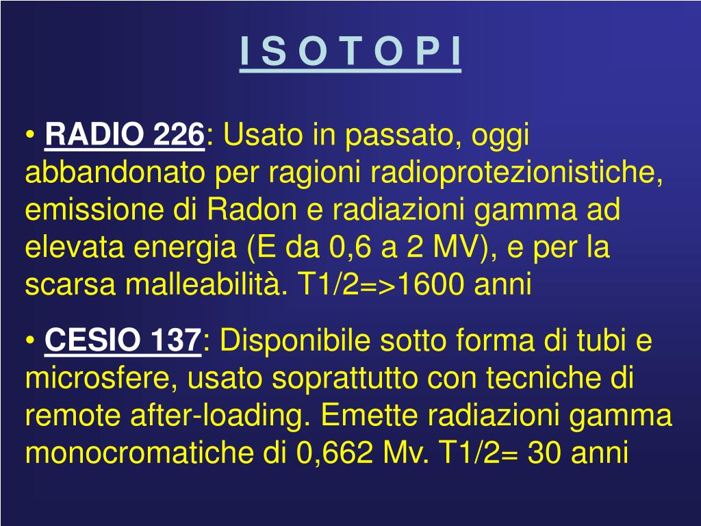 I S O T O P I • RADIO 226: Usato in passato, oggi abbandonato per ragioni radioprotezionistiche, emissione di Radon e radiazioni gamma ad elevata energia (E da 0,6 a 2 MV), e per la scarsa malleabilità. T1/2=>1600 anni • CESIO 137: Disponibile sotto forma di tubi e microsfere, usato soprattutto con tecniche di remote after-loading. Emette radiazioni gamma monocromatiche di 0,662 Mv. T1/2= 30 anni