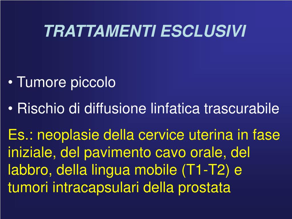 TRATTAMENTI ESCLUSIVI • Tumore piccolo • Rischio di diffusione linfatica trascurabile • Es.: neoplasie della cervice uterina in fase iniziale, del pavimento cavo orale, del labbro, della lingua mobile (T1-T2) e tumori intracapsulari della prostata