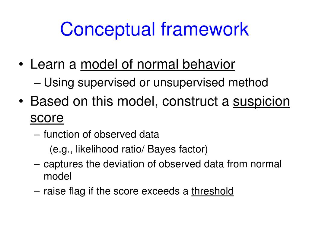 Conceptual framework • Learn a model of normal behavior • Using supervised or unsupervised method • Based on this model, construct a suspicion score • function of observed data (e.g., likelihood ratio/ Bayes factor) • captures the deviation of observed data from normal model • raise flag if the score exceeds a threshold