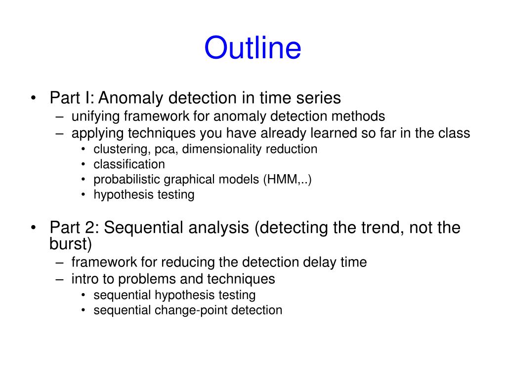 Outline • Part I: Anomaly detection in time series • unifying framework for anomaly detection methods • applying techniques you have already learned so far in the class • clustering, pca, dimensionality reduction • classification • probabilistic graphical models (HMM,..) • hypothesis testing • Part 2: Sequential analysis (detecting the trend, not the burst) • framework for reducing the detection delay time • intro to problems and techniques • sequential hypothesis testing • sequential change-point detection