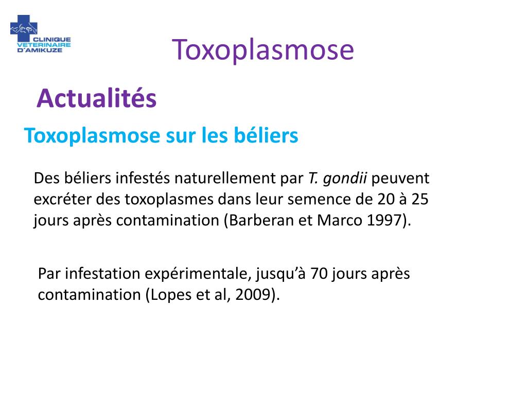 Toxoplasmose Actualités Toxoplasmose sur les béliers Des béliers infestés naturellement par T. gondiipeuvent excréter des toxoplasmes dans leur semence de 20 à 25 jours après contamination (Barberan et Marco 1997). Par infestation expérimentale, jusqu’à 70 jours après contamination (Lopes et al, 2009).