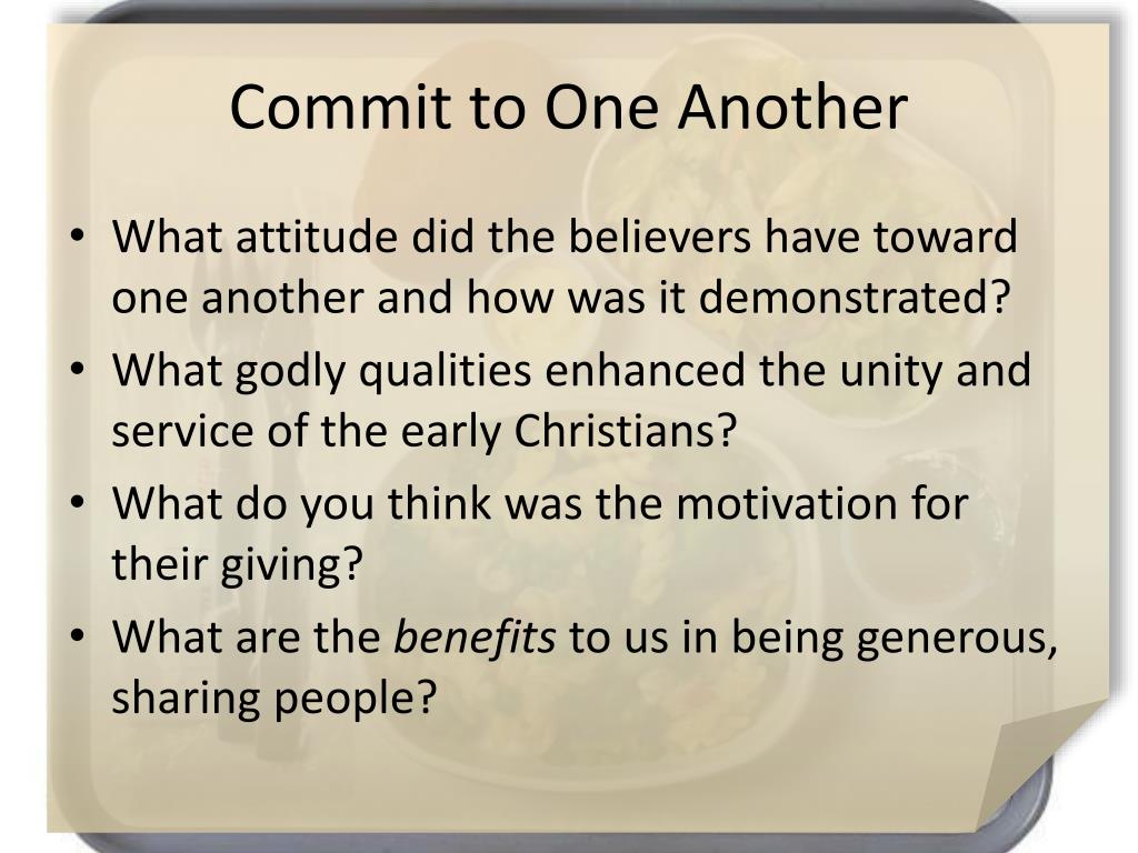 Commit to One Another • What attitude did the believers have toward one another and how was it demonstrated? • What godly qualities enhanced the unity and service of the early Christians? • What do you think was the motivation for their giving? • What are the benefits to us in being generous, sharing people?