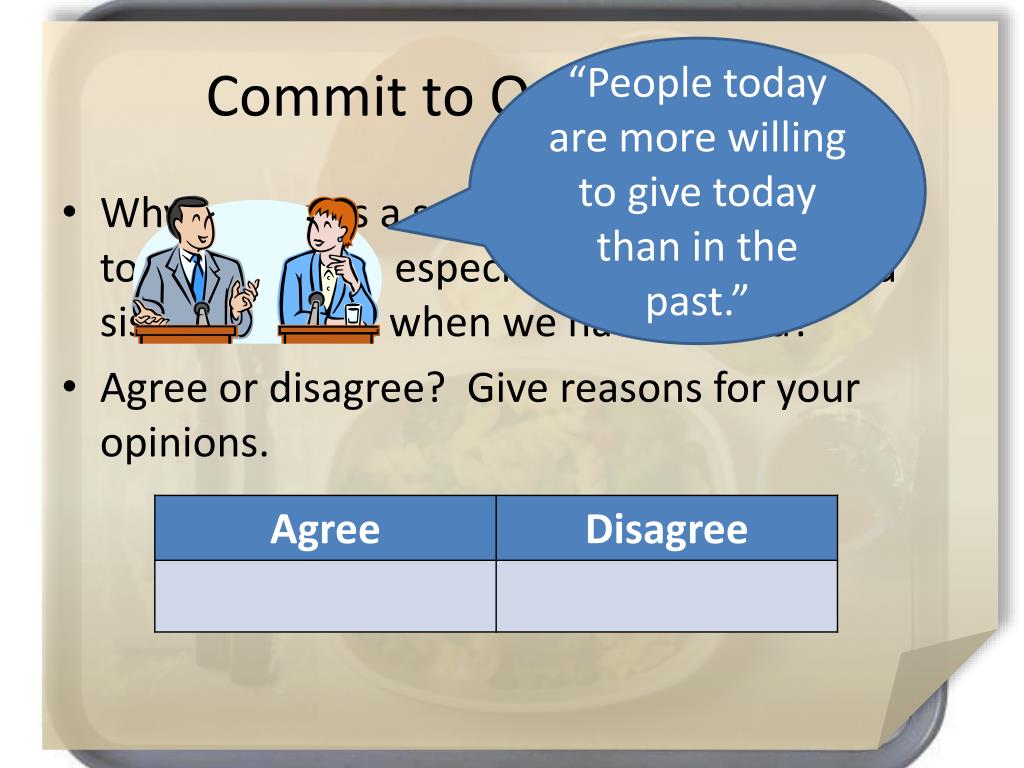 Commit to One Another “People today are more willing to give today than in the past.” • Why are we as a society sometimes hesitant to go to others, especially our brothers and sisters in Christ when we have a need? • Agree or disagree? Give reasons for your opinions.