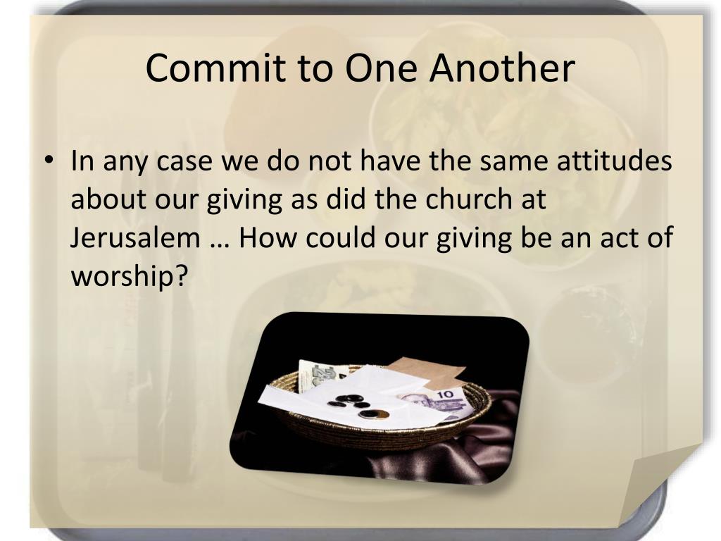Commit to One Another • In any case we do not have the same attitudes about our giving as did the church at Jerusalem … How could our giving be an act of worship?