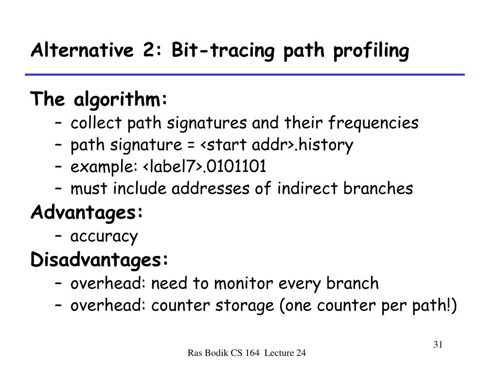 Alternative 2: Bit-tracing path profiling The algorithm: • collect path signatures and their frequencies • path signature = <start addr>.history • example: <label7>.0101101 • must include addresses of indirect branches Advantages: • accuracy Disadvantages: • overhead: need to monitor every branch • overhead: counter storage (one counter per path!) Ras Bodik CS 164 Lecture 24