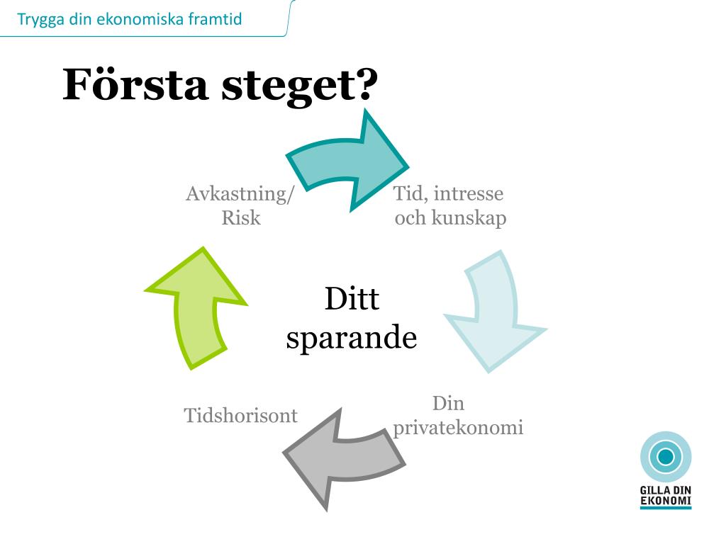 Tid, intresse och kunskap Avkastning/ Risk Din privatekonomi Tidshorisont Första steget? Ditt sparande