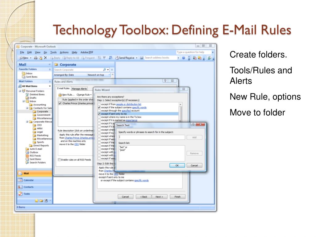 Technology Toolbox: Defining E-Mail Rules Create folders. Tools/Rules and Alerts New Rule, options Move to folder