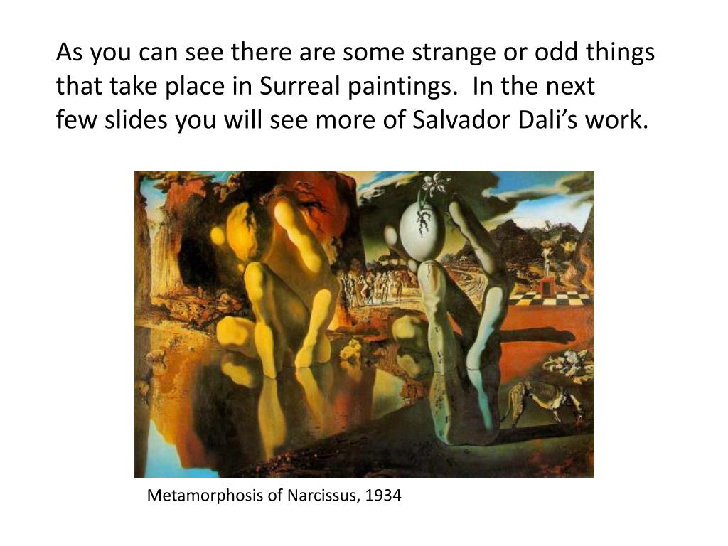 As you can see there are some strange or odd things that take place in Surreal paintings. In the next few slides you will see more of Salvador Dali’s work. Metamorphosis of Narcissus, 1934
