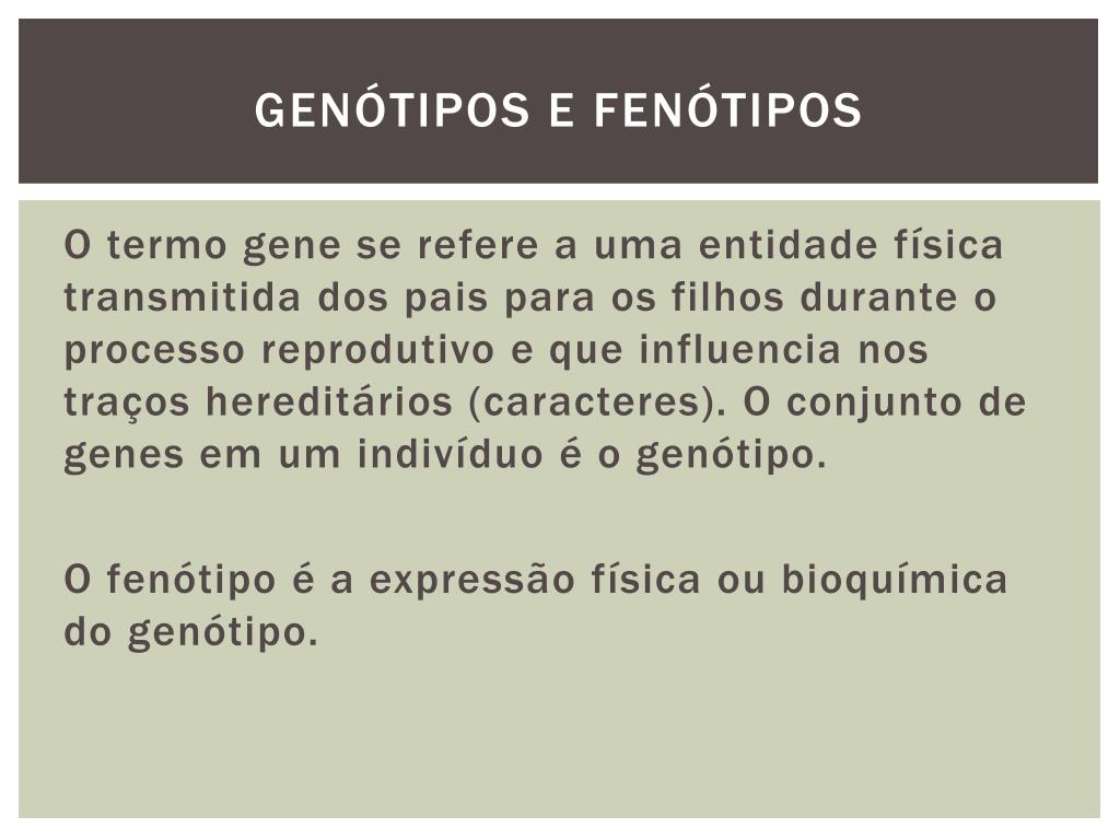 Genótipos e fenótipos O termo gene se refere a uma entidade física transmitida dos pais para os filhos durante o processo reprodutivo e que influencia nos traços hereditários (caracteres). O conjunto de genes em um indivíduo é o genótipo. O fenótipo é a expressão física ou bioquímica do genótipo.