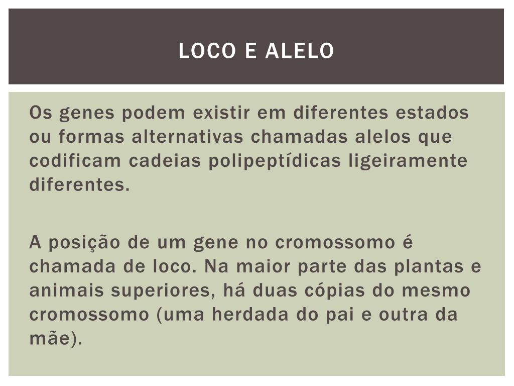 Loco e alelo Os genes podem existir em diferentes estados ou formas alternativas chamadas alelos que codificam cadeias polipeptídicas ligeiramente diferentes. A posição de um gene no cromossomo é chamada de loco. Na maior parte das plantas e animais superiores, há duas cópias do mesmo cromossomo (uma herdada do pai e outra da mãe).