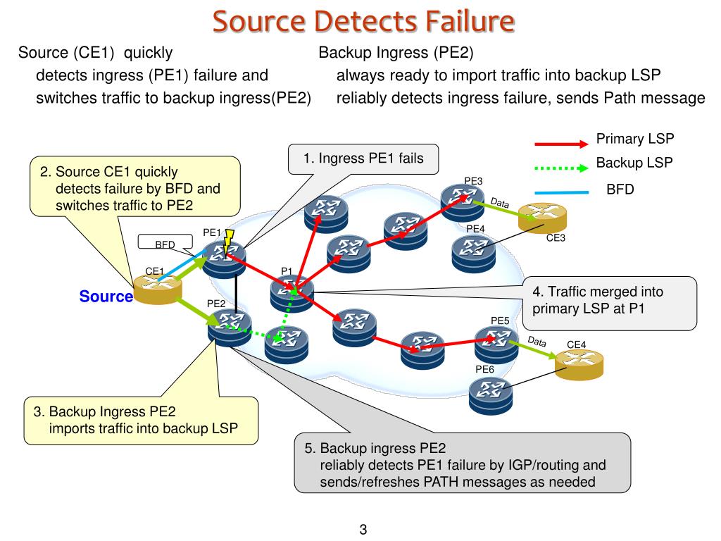 Source Detects Failure Source (CE1) quickly detects ingress (PE1) failure and switches traffic to backup ingress(PE2) Backup Ingress (PE2) always ready to import traffic into backup LSP reliably detects ingress failure, sends Path message Primary LSP 1. Ingress PE1 fails Backup LSP 2. Source CE1 quickly detects failure by BFD and switches traffic to PE2 PE3 BFD Data PE4 PE1 CE3 BFD CE1 P1 4. Traffic merged into primary LSP at P1 Source PE2 PE5 Data CE4 PE6 3. Backup Ingress PE2 imports traffic into backup LSP 5. Backup ingress PE2 reliably detects PE1 failure by IGP/routing and sends/refreshes PATH messages as needed 3