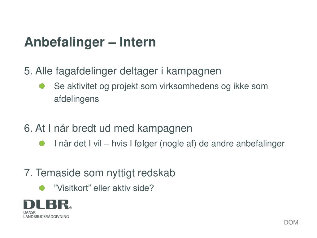 Anbefalinger – Intern 5. Alle fagafdelinger deltager i kampagnen • Se aktivitet og projekt som virksomhedens og ikke som afdelingens 6. At I når bredt ud med kampagnen • I når det I vil – hvis I følger (nogle af) de andre anbefalinger 7. Temaside som nyttigt redskab • ”Visitkort” eller aktiv side? DOM