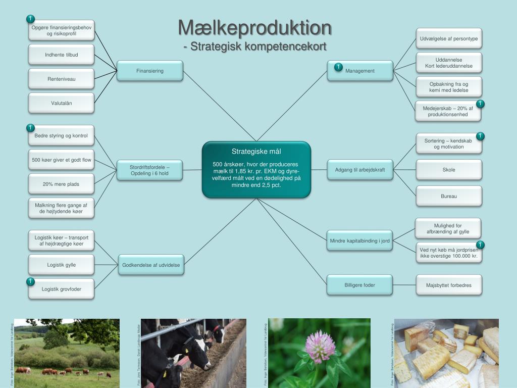 Mælkeproduktion - Strategisk kompetencekort Opgøre finansieringsbehovog risikoprofil 1 1 1 1 1 1 1 Udvælgelse af persontype Indhente tilbud Uddannelse Kort lederuddannelse Finansiering Management Renteniveau Opbakning fra ogkemi med ledelse Valutalån Medejerskab – 20% afproduktionsenhed Bedre styring og kontrol Sortering – kendskab og motivation Strategiske mål 500 årskøer, hvor der produceres mælk til 1,85 kr. pr. EKM og dyre-velfærd målt ved en dødelighed påmindre end 2,5 pct. 500 køer giver et godt flow Adgang til arbejdskraft Skole Stordriftsfordele – Opdeling i 6 hold 20% mere plads Bureau Malkning flere gange afde højtydende køer Mulighed forafbrænding af gylle Logistik køer – transportaf højdrægtige køer Mindre kapitalbinding i jord Ved nyt køb må jordprisenikke overstige 100.000 kr. Logistik gylle Godkendelse af udvidelse Billigere foder Majsbyttet forbedres Logistik grovfoder Foto: Inger Bertelsen, Videncentret for Landbrug Foto: Jens Tønnesen, Dansk Landbrugs Medier Foto: Inger Bertelsen, Videncentret for Landbrug Foto: Inger Bertelsen, Videncentret for Landbrug