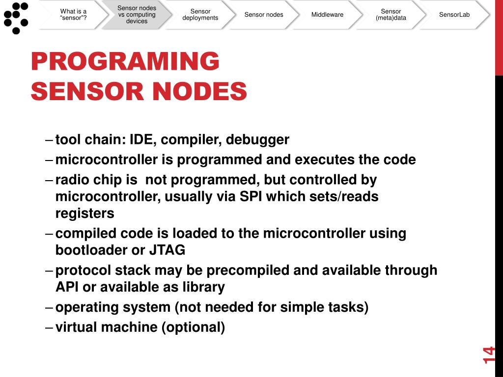 Programing Sensor nodes • tool chain: IDE, compiler, debugger • microcontroller is programmed and executes the code • radio chip is not programmed, but controlled by microcontroller, usually via SPI which sets/reads registers • compiled code is loaded to the microcontroller using bootloader or JTAG • protocol stack may be precompiled and available through API or available as library • operating system (not needed for simple tasks) • virtual machine (optional)