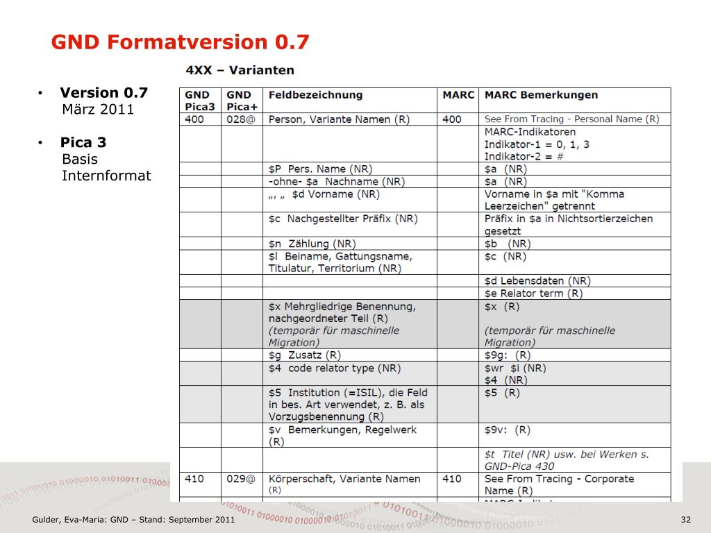 Version 0.7 • März 2011 • Pica 3 • Basis • Internformat GND Formatversion 0.7