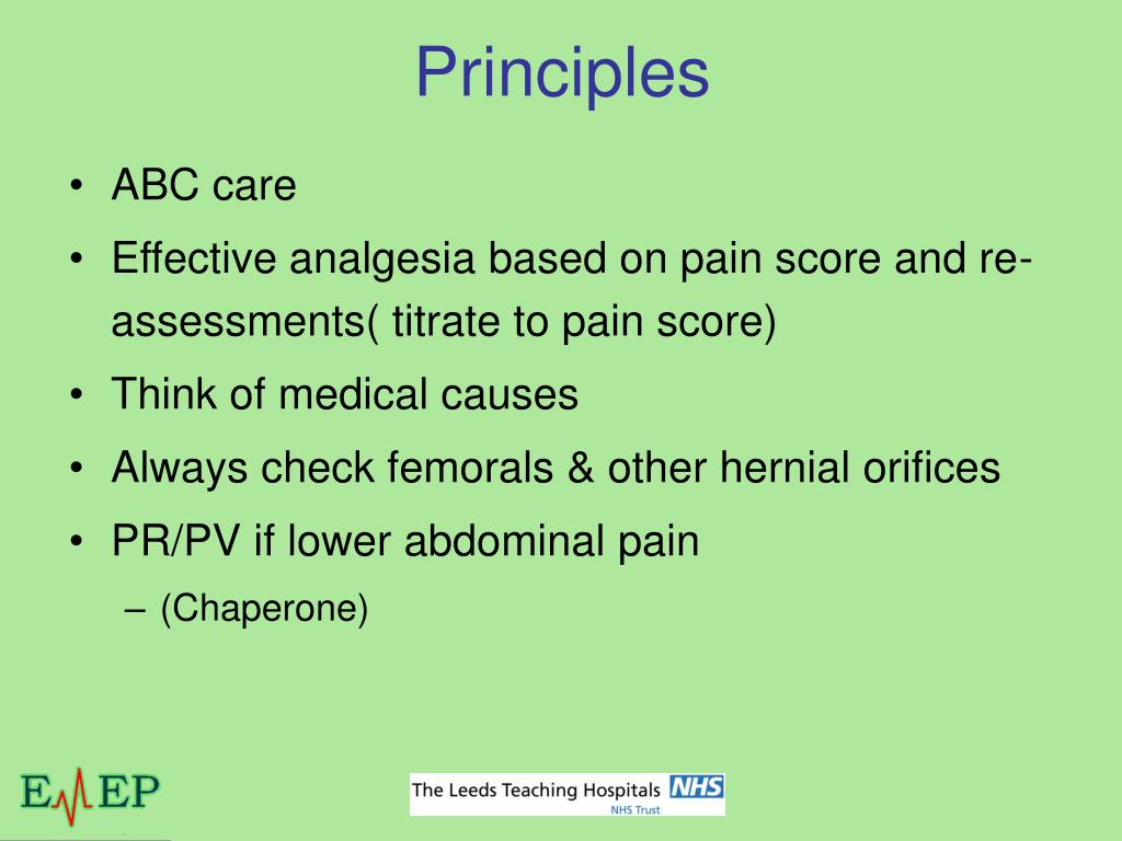 Principles • ABC care • Effective analgesia based on pain score and re-assessments( titrate to pain score) • Think of medical causes • Always check femorals & other hernial orifices • PR/PV if lower abdominal pain • (Chaperone)