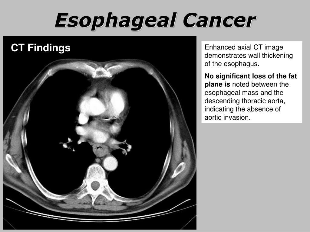 Esophageal Cancer CT Findings Enhanced axial CT image demonstrates irregular wall thickening of the esophagus. A heterogeneously enhancing mass to the right of the esophagus represents a markedly enlarged metastatic lymph node. Lack of the fat plane between the esophageal mass and the descending thoracic aorta, indicates the aortic invasion.