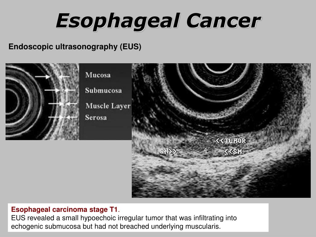 Esophageal Cancer Endoscopic ultrasonography (EUS) Esophageal carcinoma stage T1. EUS revealed a small hypoechoic irregular tumor that was infiltrating into echogenic submucosa but had not breached underlying muscularis.