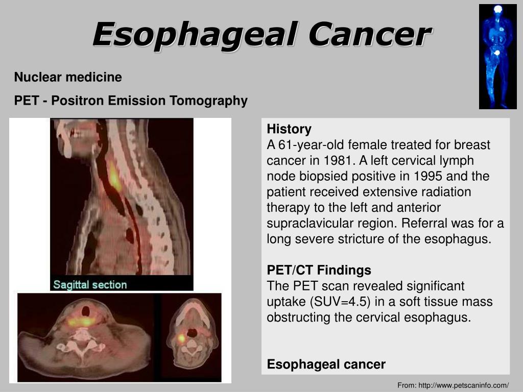 Esophageal Cancer Nuclear medicine PET - Positron Emission Tomography HistoryA 61-year-old female treated for breast cancer in 1981. A left cervical lymph node biopsied positive in 1995 and the patient received extensive radiation therapy to the left and anterior supraclavicular region. Referral was for a long severe stricture of the esophagus. PET/CT FindingsThe PET scan revealed significant uptake (SUV=4.5) in a soft tissue mass obstructing the cervical esophagus. Esophageal cancer From: http://www.petscaninfo.com/