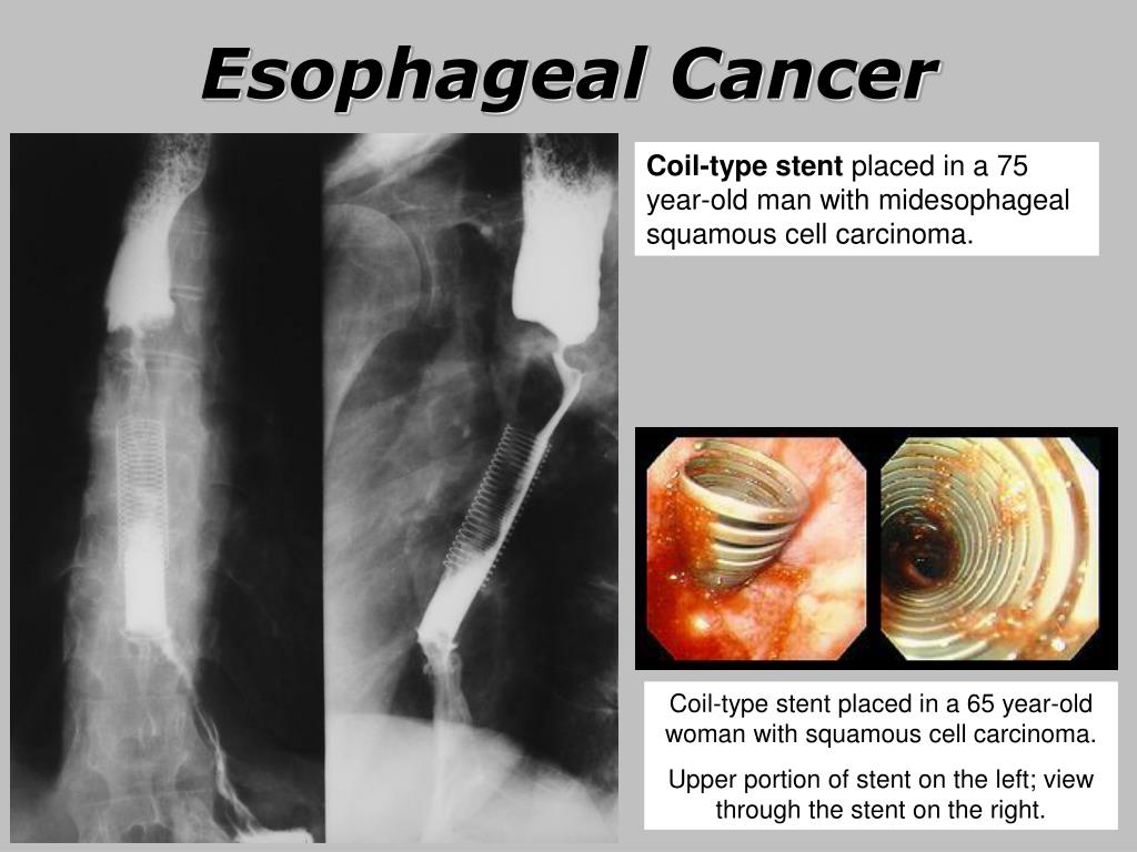 Esophageal Cancer Coil-type stent placed in a 75 year-old man with midesophageal squamous cell carcinoma. Coil-type stent placed in a 65 year-old woman with squamous cell carcinoma. Upper portion of stent on the left; view through the stent on the right.