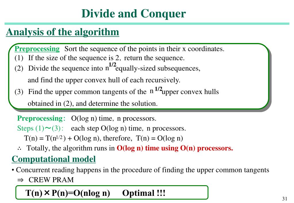 1/2 1/2 n n PreprocessingSort the sequence of the points in their x coordinates. (1)If the size of the sequence is 2,return the sequence. (2)Divide the sequence intoequally-sized subsequences, and find the upper convex hull of each recursively. (3)Find the upper common tangents of the upper convex hulls obtained in (2), and determine the solution. T(n)×P(n)=O(nlog n)Optimal !!! Divide and Conquer Analysis of the algorithm • Preprocessing:O(log n) time,n processors. • Steps (1)〜(3):each step O(log n) time,n processors. T(n) = T(n) + O(log n), therefore, T(n) = O(log n) • ∴Totally, the algorithm runs in O(log n) time using O(n) processors. Computational model • Concurrent reading happens in the procedure of finding the upper common tangents ⇒CREW PRAM 1/2