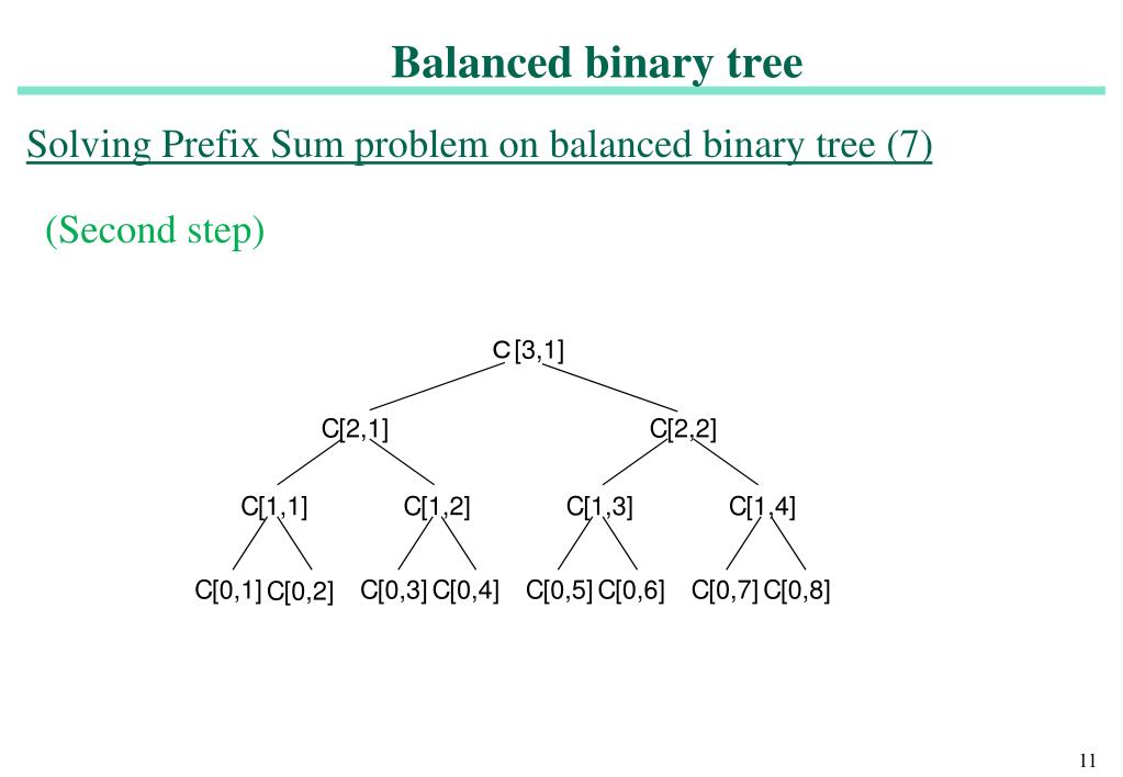 Solving Prefix Sum problem on balanced binary tree (3) Balanced binary tree • Correctness of the algorithm • When step (1) finished, the sub-sum in each internal node is the sum of its subtree.