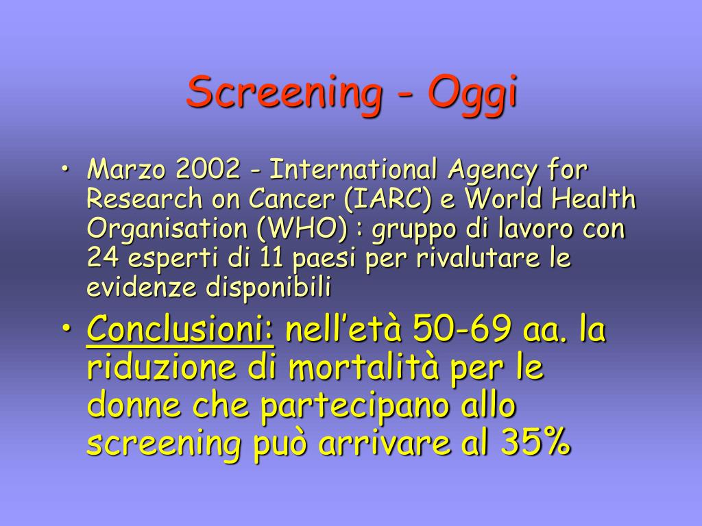 Screening - Oggi • Marzo 2002 - International Agency for Research on Cancer (IARC) e World Health Organisation (WHO) : gruppo di lavoro con 24 esperti di 11 paesi per rivalutare le evidenze disponibili • Conclusioni: nell’età 50-69 aa. la riduzione di mortalità per le donne che partecipano allo screening può arrivare al 35%