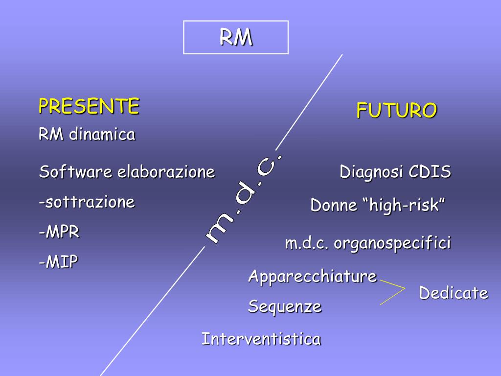 RM PRESENTE FUTURO RM dinamica Software elaborazione -sottrazione -MPR -MIP Diagnosi CDIS m.d.c. Donne “high-risk” m.d.c. organospecifici Apparecchiature Sequenze Dedicate Interventistica