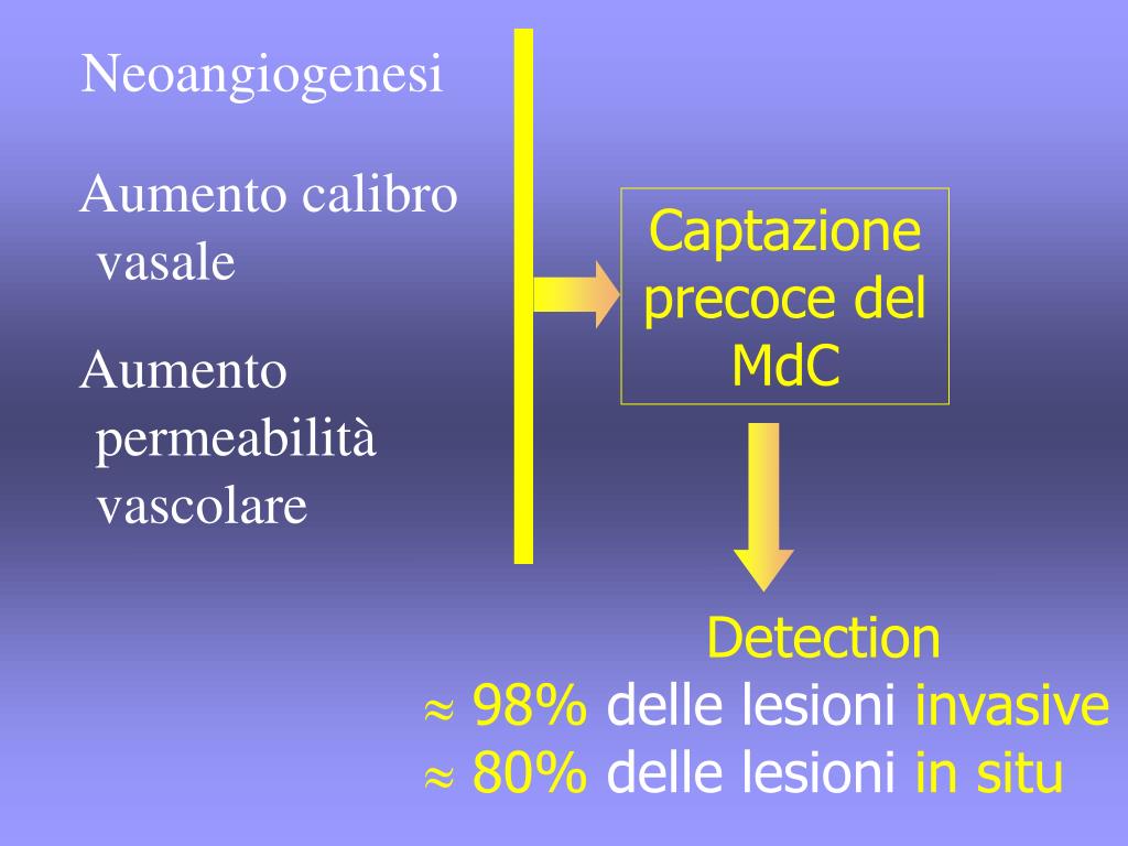 Captazione precoce del MdC Neoangiogenesi Aumento calibro vasale Aumento permeabilità vascolare Detection 98% delle lesioni invasive 80% delle lesioni in situ