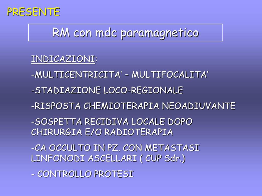 PRESENTE RM con mdc paramagnetico INDICAZIONI: -MULTICENTRICITA’ – MULTIFOCALITA’ -STADIAZIONE LOCO-REGIONALE -RISPOSTA CHEMIOTERAPIA NEOADIUVANTE -SOSPETTA RECIDIVA LOCALE DOPO CHIRURGIA E/O RADIOTERAPIA -CA OCCULTO IN PZ. CON METASTASI LINFONODI ASCELLARI ( CUP Sdr.) - CONTROLLO PROTESI
