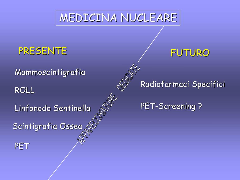 MEDICINA NUCLEARE PRESENTE FUTURO Mammoscintigrafia Radiofarmaci Specifici ROLL APPARECCHIATURE DEDICATE PET-Screening ? Linfonodo Sentinella Scintigrafia Ossea PET