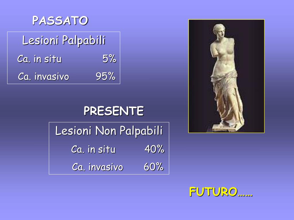 PASSATO Lesioni Palpabili Ca. in situ 5% Ca. invasivo 95% PRESENTE Lesioni Non Palpabili Ca. in situ 40% Ca. invasivo 60% FUTURO……