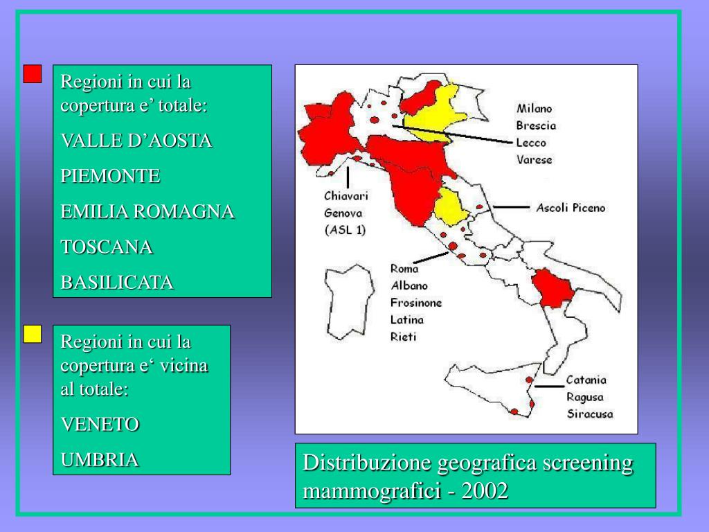 Regioni in cui la copertura e’ totale: VALLE D’AOSTA PIEMONTE EMILIA ROMAGNA TOSCANA BASILICATA Regioni in cui la copertura e‘ vicina al totale: VENETO UMBRIA Distribuzione geografica screening mammografici - 2002