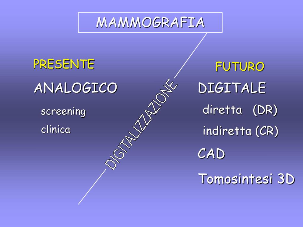 MAMMOGRAFIA PRESENTE FUTURO ANALOGICO DIGITALE diretta (DR) indiretta (CR) screening clinica DIGITALIZZAZIONE CAD Tomosintesi 3D