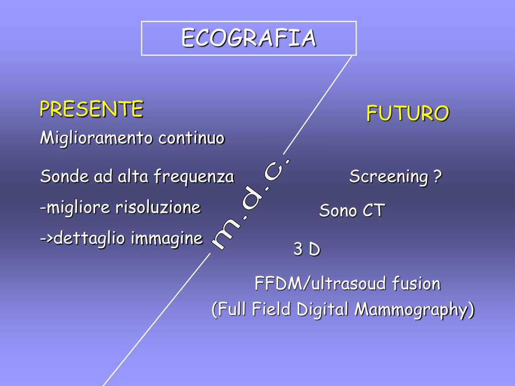 ECOGRAFIA PRESENTE FUTURO Miglioramento continuo Sonde ad alta frequenza -migliore risoluzione ->dettaglio immagine Screening ? m.d.c. Sono CT 3 D FFDM/ultrasoud fusion (Full Field Digital Mammography)