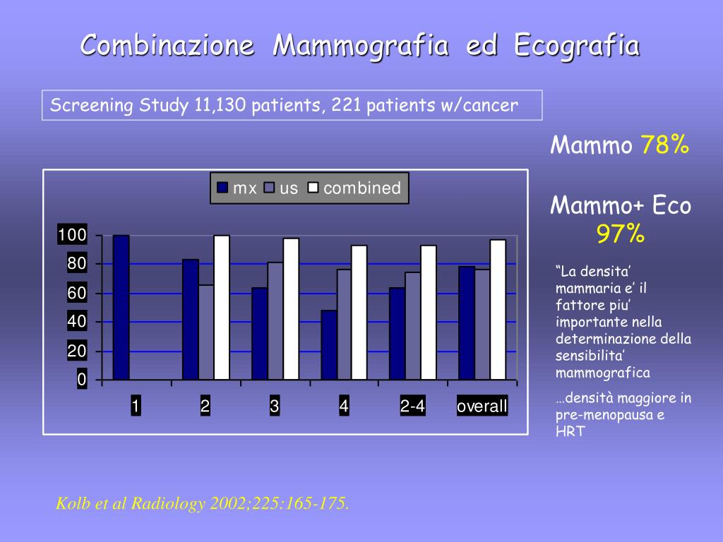 Combinazione Mammografia ed Ecografia Screening Study 11,130 patients, 221 patients w/cancer Mammo78% Mammo+ Eco97% “La densita’ mammaria e’ il fattore piu’ importante nella determinazione della sensibilita’ mammografica …densità maggiore in pre-menopausa e HRT Kolb et al Radiology 2002;225:165-175.