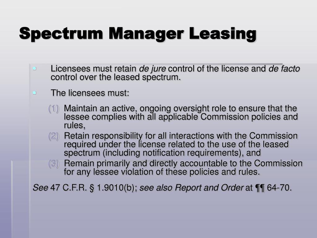 Spectrum Manager Leasing • Licensees must retain de jure control of the license and de facto control over the leased spectrum. • The licensees must: • Maintain an active, ongoing oversight role to ensure that the lessee complies with all applicable Commission policies and rules, • Retain responsibility for all interactions with the Commission required under the license related to the use of the leased spectrum (including notification requirements), and • Remain primarily and directly accountable to the Commission for any lessee violation of these policies and rules. See 47 C.F.R. § 1.9010(b); see alsoReport and Order at ¶¶ 64-70.